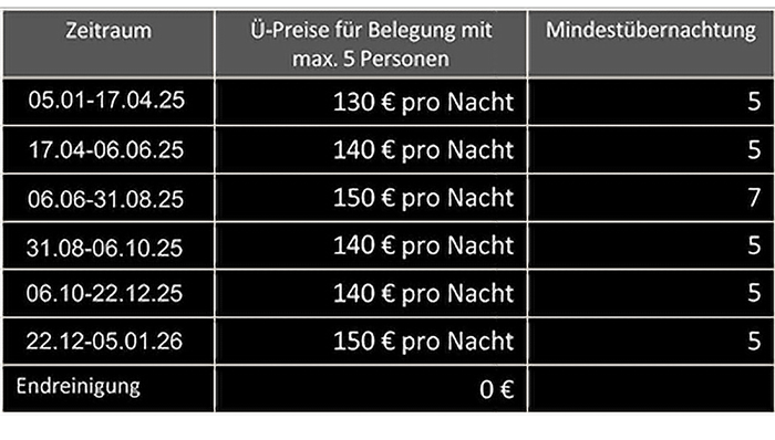 Kürzere Buchungen wie zum Beispiel ein verlängertes Wochenende sind auf Anfrage möglich...
